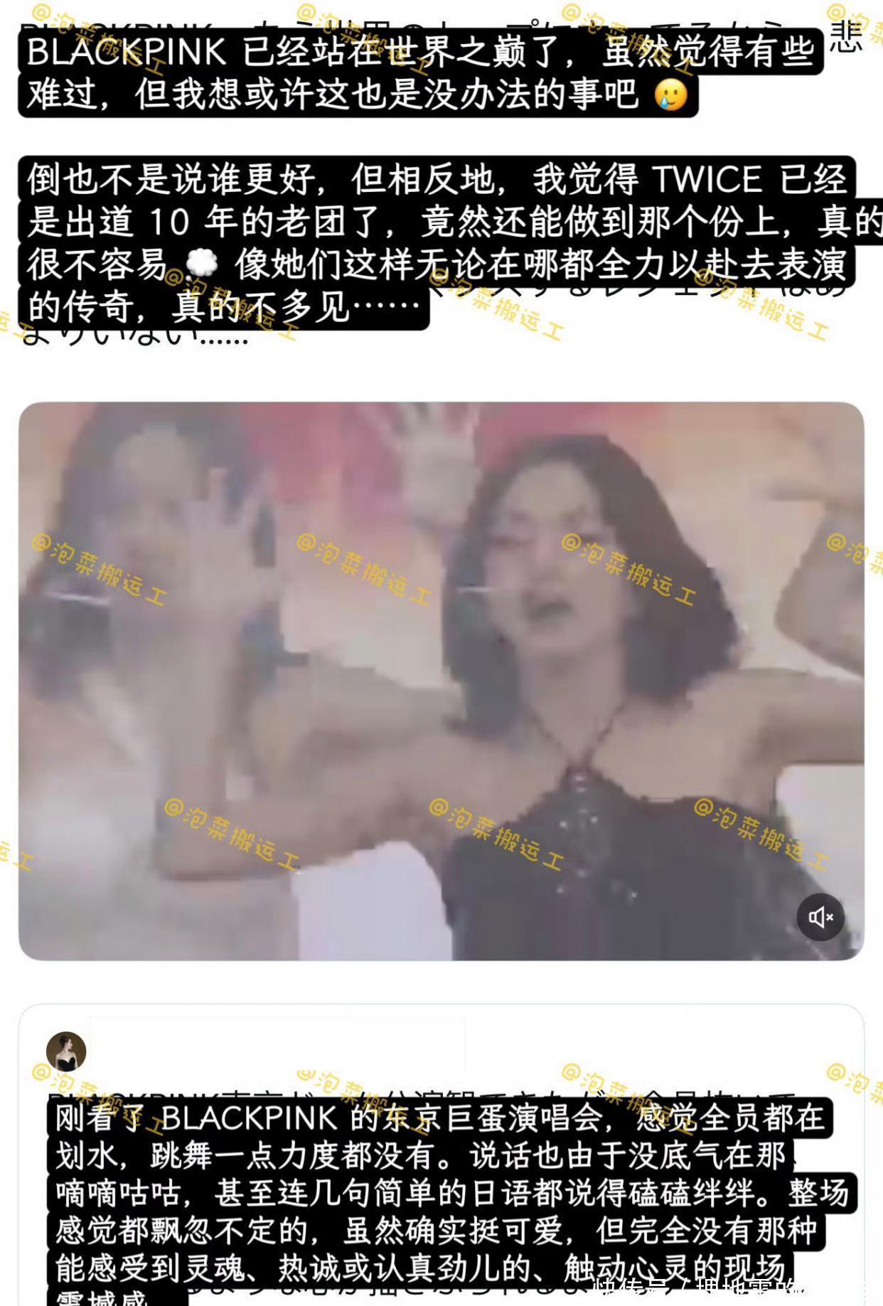 讨论中频繁提及对比团体TWICE,有观点认为出道10年的TWICE仍能全力以赴演出,反衬BLACKPINK的松懈。此类对比引发双方粉丝互攻,甚至延伸至对TWICE成绩的贬损言论,凸显长期积累的饭圈对立情绪。