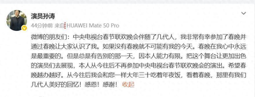 在流量当道、急功近利的文艺圈,孙涛的告别显得尤为清醒与体面。他在视频中坦诚道出两大缘由:“一是个人能力有限,难以持续呈现超越过往的作品;二是年龄渐长,希望将这么好的平台让给更优秀的年轻演员” 。这份朴实的告白没有煽情辞藻,却尽显老艺术家的通透与格局。事实上,孙涛已连续缺席2024-2026年三届春晚,2023年的《上热搜了》早已是他的谢幕之作。这三年间,他并非没有尝试重返舞台,而是始终未能创作出令自己满意的作品,在“无合适作品不登台”的原则下,他选择了体面退场。相较于不少艺人将春晚视为名利场拼尽全力留守,孙涛放下“春晚常客”的光环,承认创作局限、主动让贤后辈的选择,更显职业素养与人生智慧。