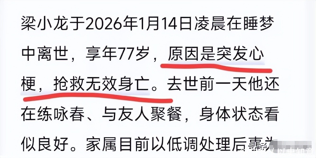 然而这份期盼尚未落地,梁小龙猝然离世的消息便如晴天霹雳般袭来,且来得毫无征兆,绝大多数人第一反应皆为震惊与否认:“这不可能是真的!”“一定是假消息!”