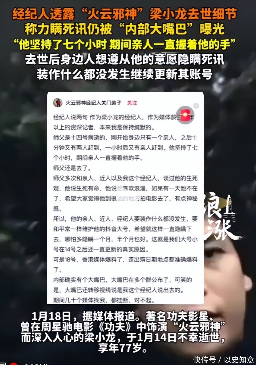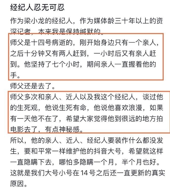 不仅关于他真实死因的讨论持续发酵,其经纪人遭到无端指责,更令人心寒的是,梁小龙生前最后的心愿竟被个别人恶意利用和破坏……